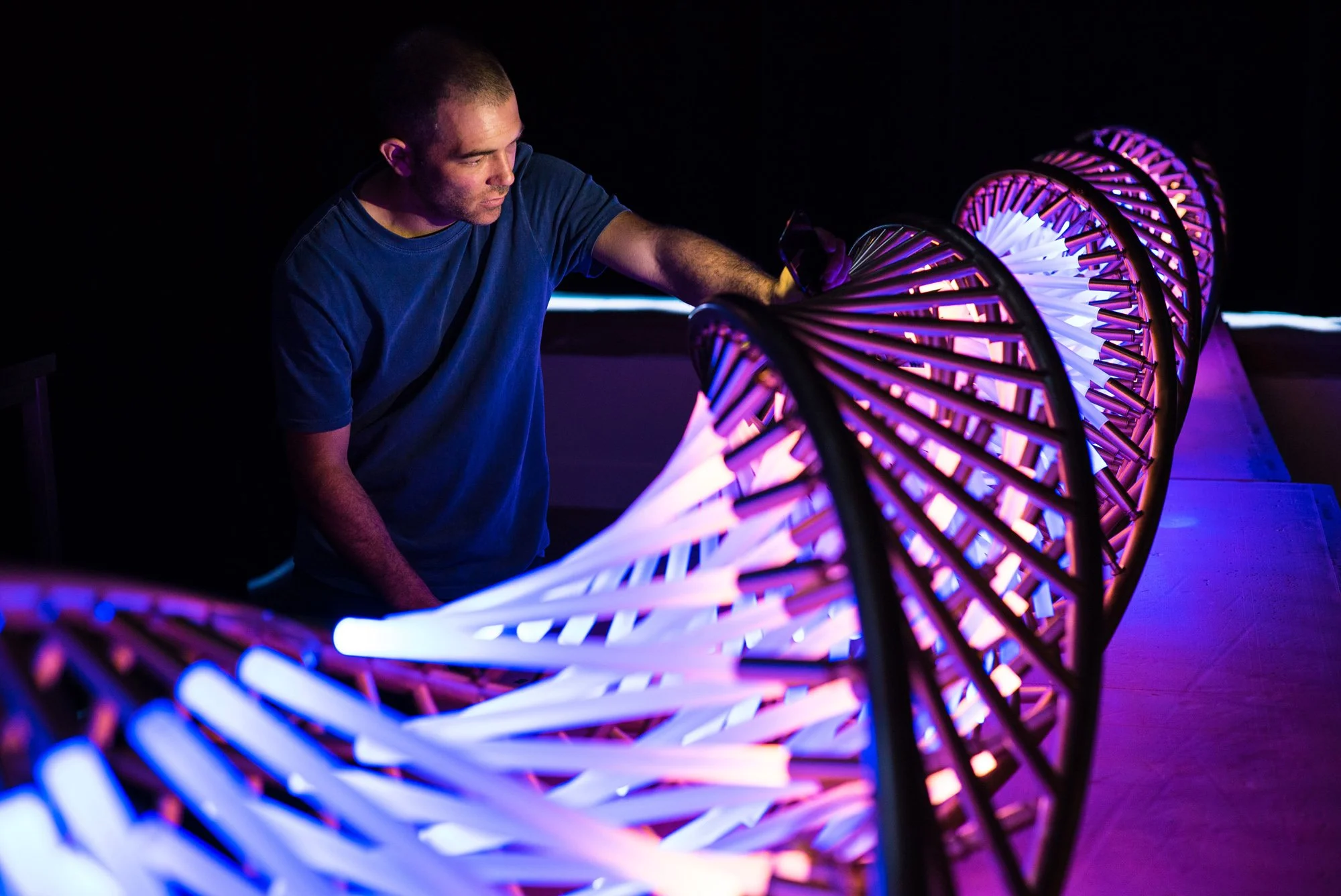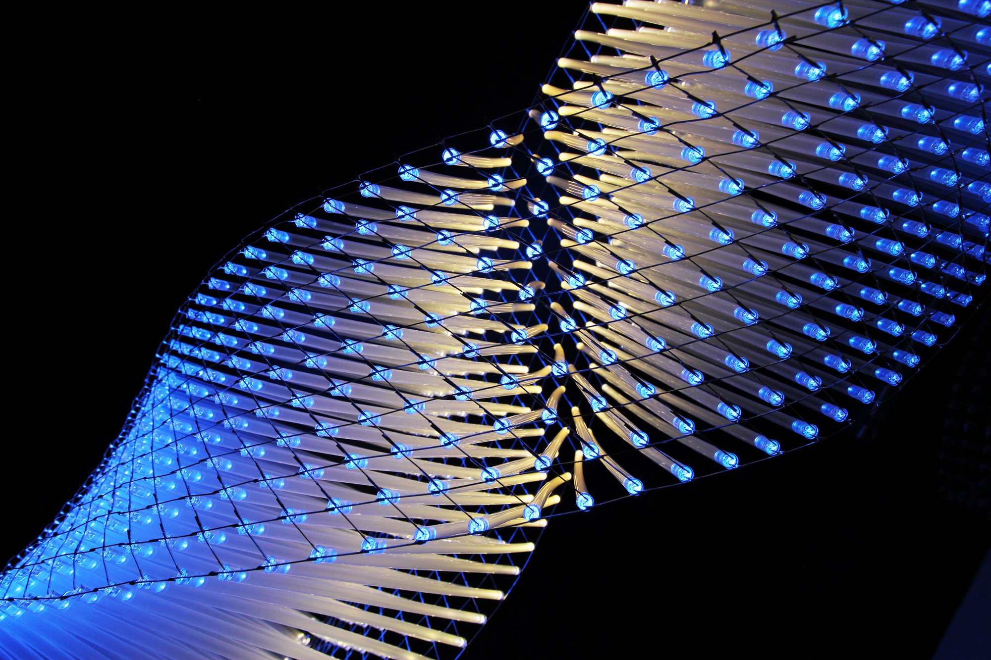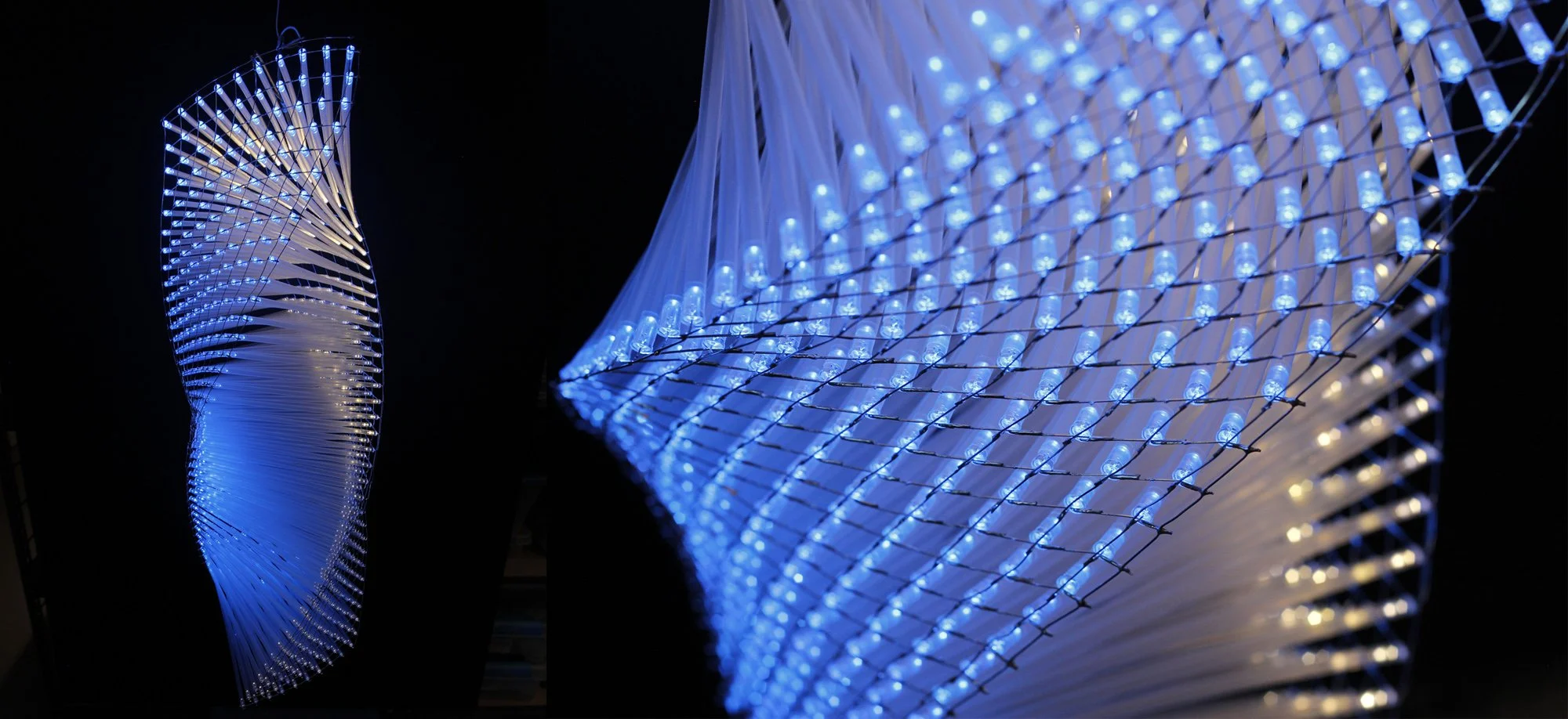 Combining light and geometric transformations lies at the heart of our creative practice. These artworks start as square grids of lights facing one another. Drinking straws are used to attach each of the points of the two grids to one another. The resulting form is a cube with lights on two faces, joined by an array of light diffusing straws. The real magic happens when the grids are deformed. Pulling on the opposing corners of the grids causes the square-shaped polygonal mesh to become diamond-shaped. The resulting volume becomes helical and the pattern can be continued.